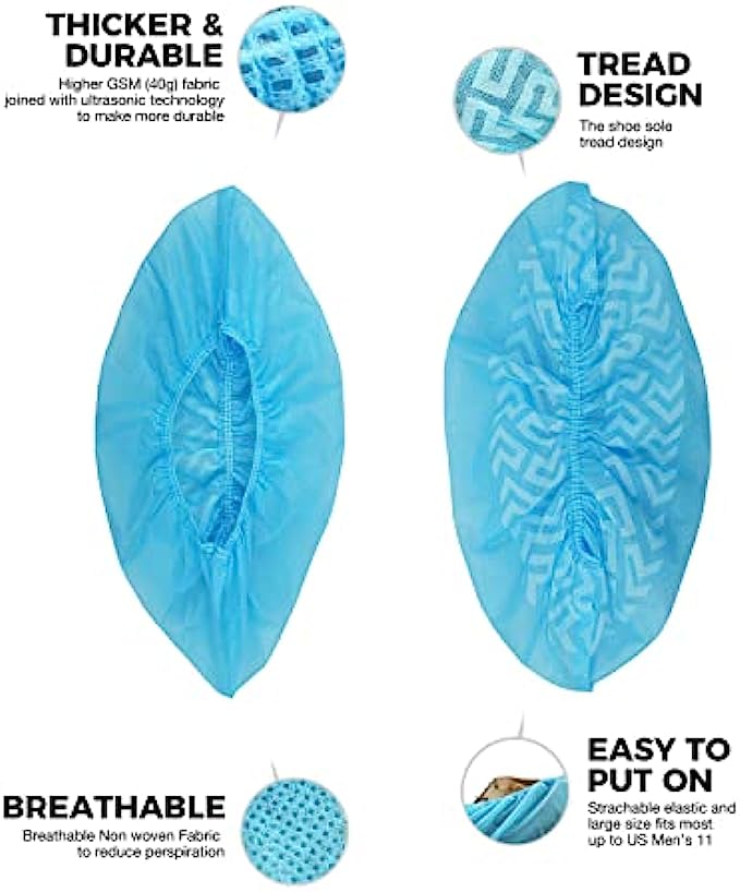 ✅ HIGH QUALITY MACHINE MADE: We use two options to make shoe covers more durable and snug: Machine made with thicker 35 gsm non-woven material, and strengthening the boot opening with double durable rubber band. They can better suitable for working long hours, such as cleaning or construction.