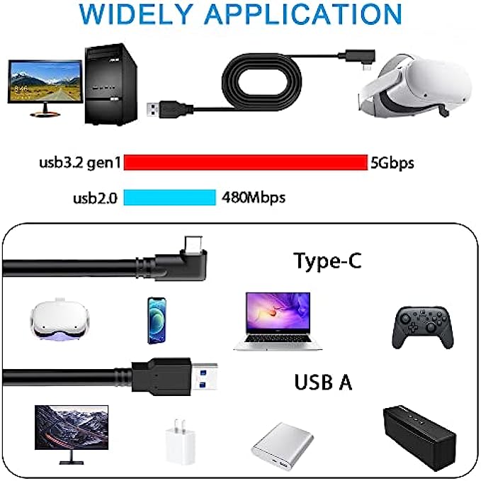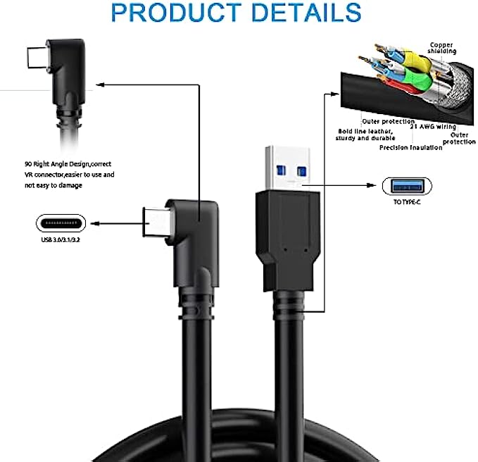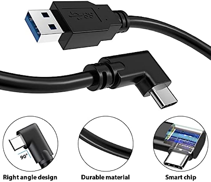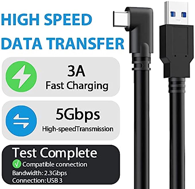 LINK CABLE: 16-foot long charger, L-shaped design, not easy to fall off, allowing you to move freely without restriction while playing games. 90° right angle, preventing disconnection, more stable, giving you an immersive VR gaming experience. usb 3 to usb c to pc, up to 3A to charge while in use, saving charging time.