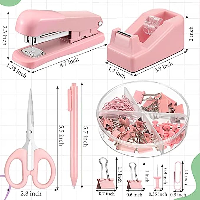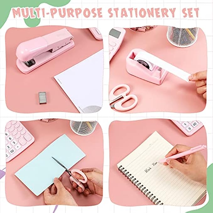 Value Pack: you can get 1 stapler, 1 desktop tape dispenser, 1 ballpoint pen, 1 box of binder clips and paper clips, 1 scissor and 1 calculator, such a complete office supplies combination is enough to meet your study or office needs