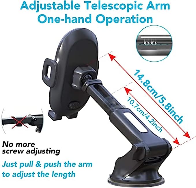 Broad Compatibility: This Phone Car Holder, with its rubber coated grips for Enhanced Stability and Protection, thanks to specialized grips that expand up to 4" wide, this car phone mount is compatible with iPhone 13 12 11 XS Max XR X 8 Plus 7 6S 6 5S SE, Samsung Galaxy S10 S10+ S10e S9 S9+ S8+ S8 S7 Edge S6 S5, A9 A8+ A8 A7 Pro C8 C7 C5, Note 9 8 6 5,Google Pixel 3 3XL,Nexus 5 5X 6P, LG V35 V30 V20,Oneplus 6T 6,etc. even with case on device. Industrial-strength suction cup windshield/dashboard phone holder: Paired with APPS2Car's industry leading suction-cup technology, with a coating of sticky gel for seriously secure mounting on your windshield. It attaches firmly to the vehicle windshield and stays mounted in hot or cold. This product includes an extra 3M sticky dashboard pad for a stronger hold in the case of dash placement. Full Range of Motion: The cradle holder rotates 360°, enabling you to view your device in portrait or landscape orientation. The car phone mount holder has a pivoting and telescopic arm that helps you position your phone in the optimum position. You can pivot the arm up to a 240° arc, and extend the arm from 4.6" to 6.3". Quick-release Button for Easy Phone Access: This hands-free Car Phone Mount with the One-click release button design, you can just press the button on the back of the holder to release the two sides grips, then snap device into place, your phone is good and secure. Easy to place and remove your smartphones with just one hand. Reliable Strong Suction Cup Windshield/Dashboard Phone Holder for Car: The Suction Mount Phone Holder has a strong suction cup with Industrial-leading technology that adheres to most smooth surfaces, such as dashboards, windshields, countertops, desks, tables and other surfaces except leather, vinyl and soft surface. NOTE: Clean and dry the mounting surface with the cloth before installation.