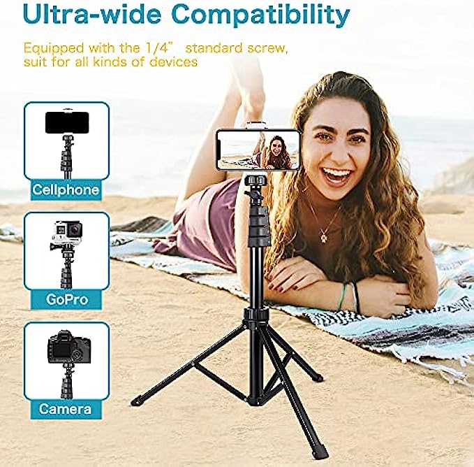 Admirable Height of 62in/5.2ft–With a retracted height of 18.2 inches/1.5 feet and full extension at 62 inches/5.2 feet, it can be locked and secured at any height in between, satisfying most smartphone users’ photography needs.