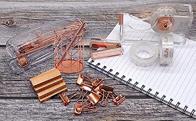【Specification】 the gold stapler size:6.14 x 1.41x 2.56 inch; Tape dispenser size:4.88 x 1.41 x 2.64 inch; Staple Remover size is 2.36x 0.61x 1.57inch; Binder Clips szie is 0.75x 0.35inch; Pencil Holder size is 3.15x 3.86inch, all rose gold rose gold tape dispenser and stapler are regular size for office desk use.