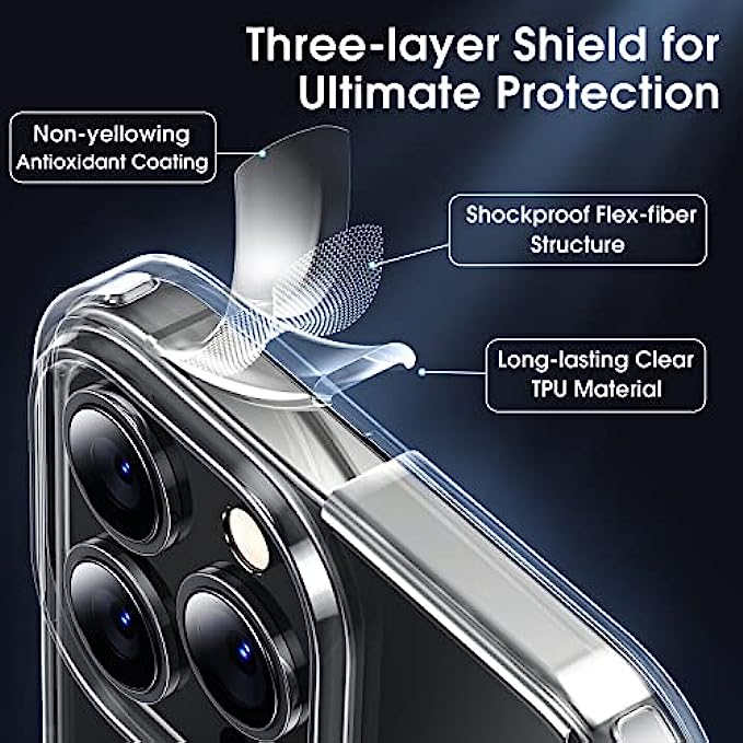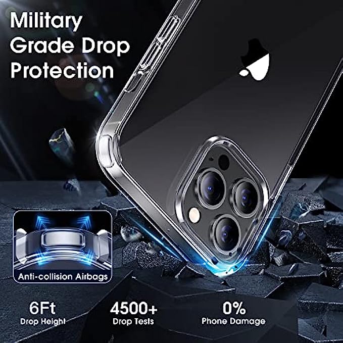 [Crystal Clear & Never Yellow]: Using high-grade Bayer's ultra-clear TPU and PC material, allowing you to admire the original sublime beauty for iPhone 13 Pro Max while won't get oily when used. "Never yellow" thanks to the nano-grade diamond anti-oxidation coating which can effectively resist 99.9% of yellowing caused by ultraviolet rays and sweat. [Military-grade Protection]: Equipped with Flex-impact Cushion Tech to disperse severe shocks, guaranteed with [MIL-STD-810G] standard. The backplane is made with rigid polycarbonate and flexible shockproof TPU bumpers around the edge to create tough protection. [Raised Camera & Screen Protection]: Raised bezels prevent screen and camera against drops & scratches. The tiny design of 2.5 mm lips over camera, 1.2 mm bezels over screen and 0.5 mm raised corner lips on the back provides extra and comprehensive protection. [Fit Snugly & Slim Design]: Crystal Clear Case wraps seamlessly around your phone to stop dust from entering and scratching your phone. And pairs perfectly with most screen protectors in market. 0.04 inch ultra-slim allows your phone to fit easily your pocket. [Anti-fingerprints & Non-slip Grip]: Processed TPU frame provides a secure non-slip grip designed for texting, gaming and selfies. Upgraded ultra-clean backplane, adding exclusive AF Anti-fingerprint coating can effectively reduce fingerprint residues and enjoy long-term cleanliness?️Any product issues, please contact us via Amazon Message Center.