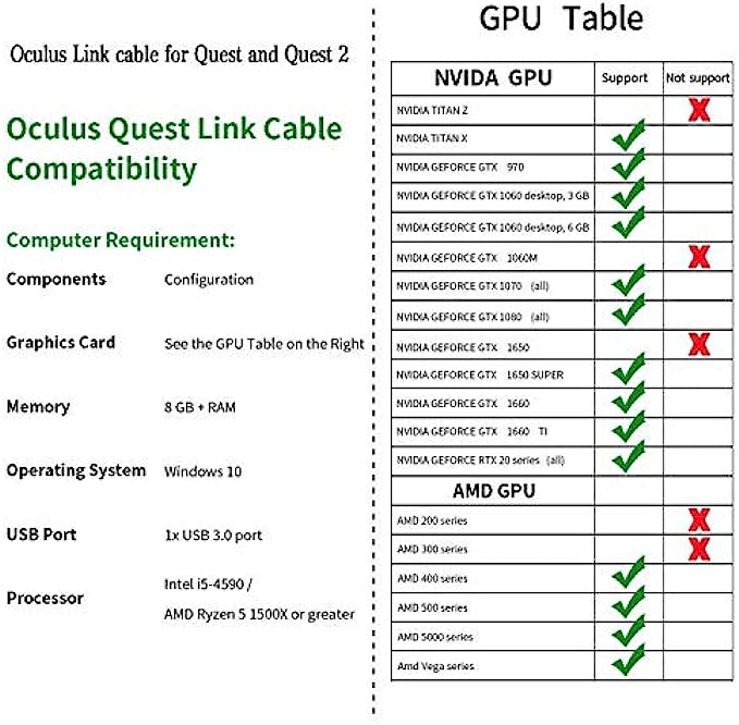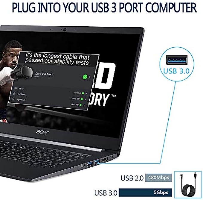 USB 3.2 GEN 1 : Data transfer rate up to 5Gbps, which allows it connects Quest2 Link Program with no lag. Please make sure to plug it into USB 3.0 slot on the motherboard or GPU to ensure optimal performance.