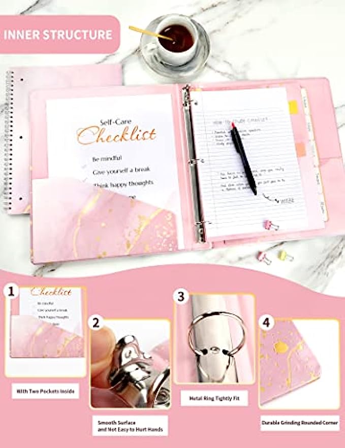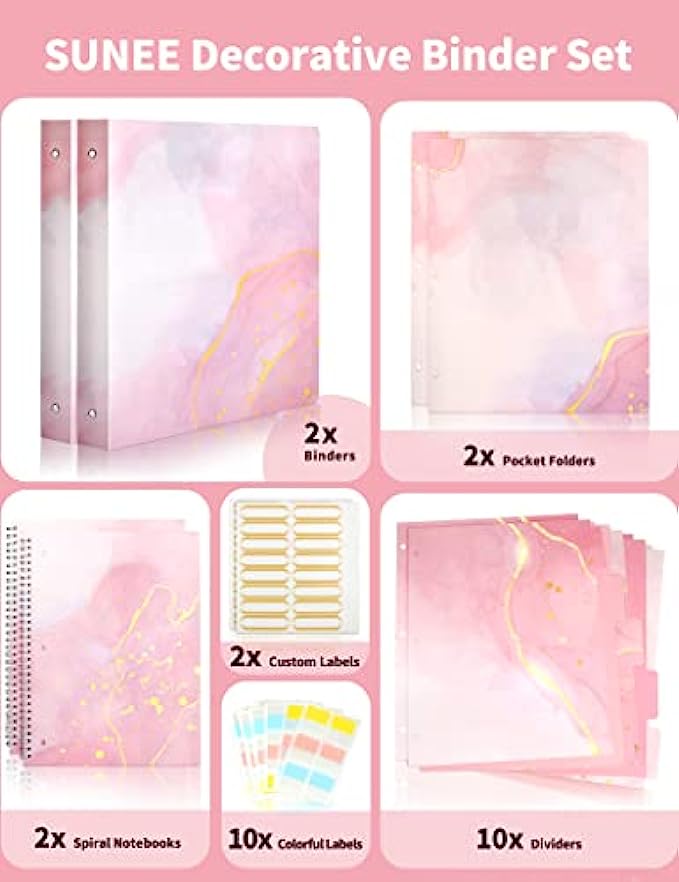 Cute Binders SUNEE 2 Pack 3 Ring Binder 1 Inch with 2 Pockets, 10 Tab Dividers, 2 Pocket Folders & 2 Spiral Notebooks, Pink Marble Heavy Duty Binder (Fit 8.5x11 Inches) for School Office Supplies