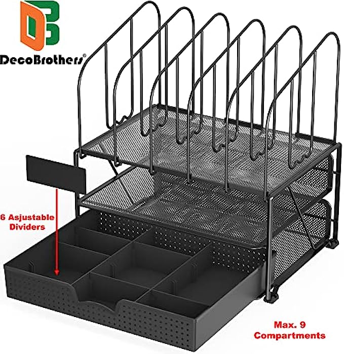 DecoBros Mesh Desk Organizer with Double Tray, 5 Upright Sections and Sliding Drawer, Black