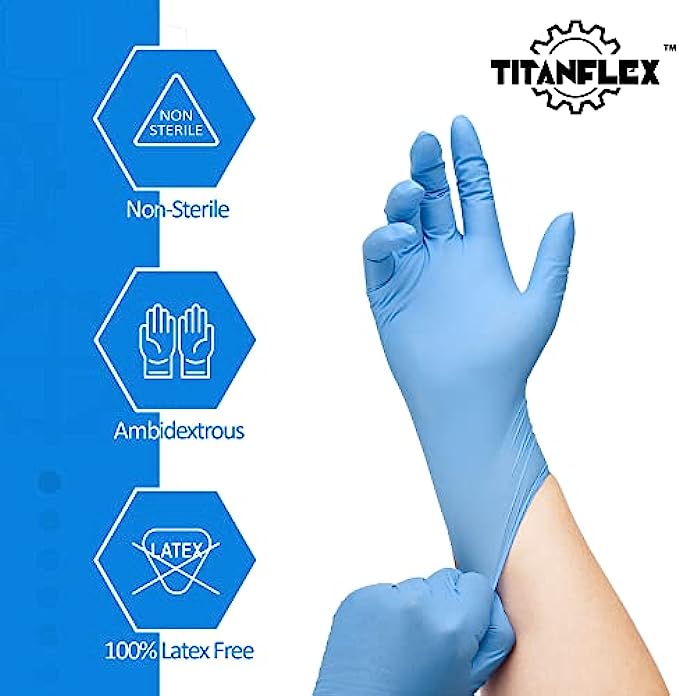 Imported 6-mil HEAVY DUTY: Our thick nitrile disposable gloves are chemical & puncture-resistant, providing a higher level of hand protection against liquids, greases, & sharp objects. The textured finish provides slip resistance in wet or dry conditions. LATEX GLOVES: Our disposable latex free gloves are non-irritating and hypoallergenic, offering superior strength and snug comfort - perfect for users with allergic skin reactions. It vastly reduces cross-contamination among users of sensitivity. FOOD SAFE GLOVES: Our disposable rubber gloves are food grade that can be used as disposable food gloves, cooking gloves, food handling gloves, and food service gloves. MULTIPURPOSE: Our non-sterile non-latex gloves can be used for household, industrial and commercial tasks, e.g. cleaning gloves, cooking gloves, food prep gloves, tattoo gloves, mechanics gloves, barber gloves, BBQ gloves, painting & animal handling. SIZES & PACKAGING: Our single-use gloves come by 100 pcs in a dispenser box, and 10 boxes in a case (1000 gloves bulk). These ambidextrous gloves are in small, medium, large and extra large (XL) sizes, suitable for men and women.