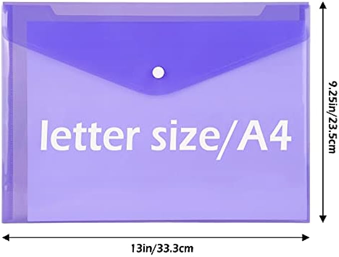 SIZE AND COLOR: The plastic folders is 33.3 x 23.6 cm / 13.1 x 9.3 inches. There are 8 kinds of bright colors: blue, green, purple, orange, white, dark blue, yellow, red, different color folders can help organize different types of files.