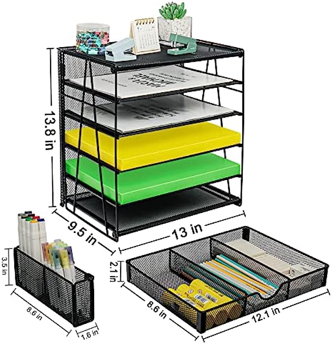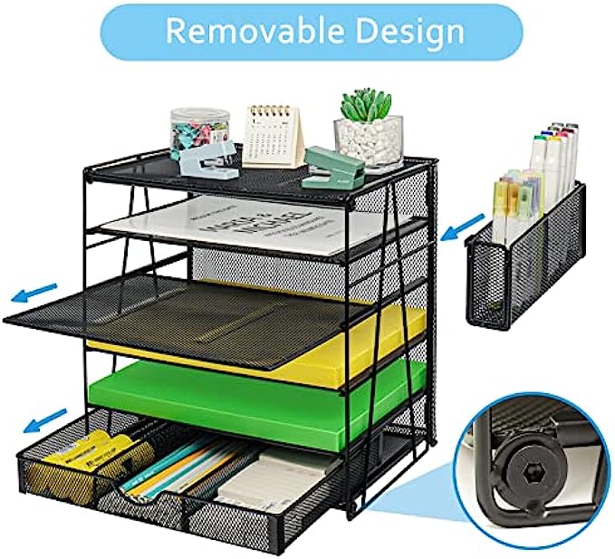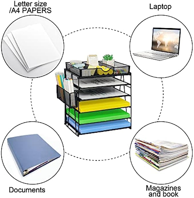 【Super Large Capacity】5 tier desk organizers and storage is ideal for your office, it has enough storage space for all your desk supplies can sort your files, paper, which is very convenient for you to find the files you need. This Letter tray design hanging pencil holder (with built-in hooks) has two to organize all your pens and pencils, and the sliding drawer can be placed at will and provides great space for your desktop.
