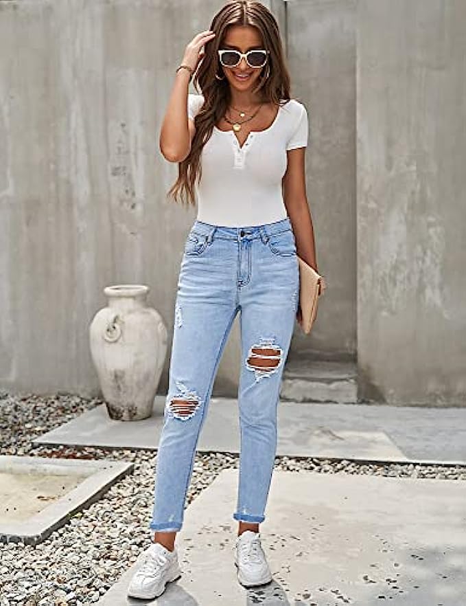72% Cotton, 27% Polyester, 1% Spandex Imported Zipper closure Machine Wash These high rise distressed jeans for women are featured in relaxed fit, tapered leg and ankle length with optional rolled cuffs. Stretchy mom jeans are sure to flatter your curves perfectly. Casual relaxed fitting mom jeans with ripped detailing, 5 traditional pockets, zip fly and button closure. Ripped denim jean pants for women with soft, breathable, durable and stretchy denim fabric for everyday comfort. Keep your look trendy and laid back by wearing these fashion ankle jeans with a comfy tee and sneakers, boots or heels. The tapered leg design will elongate your legs and balance your figure well.