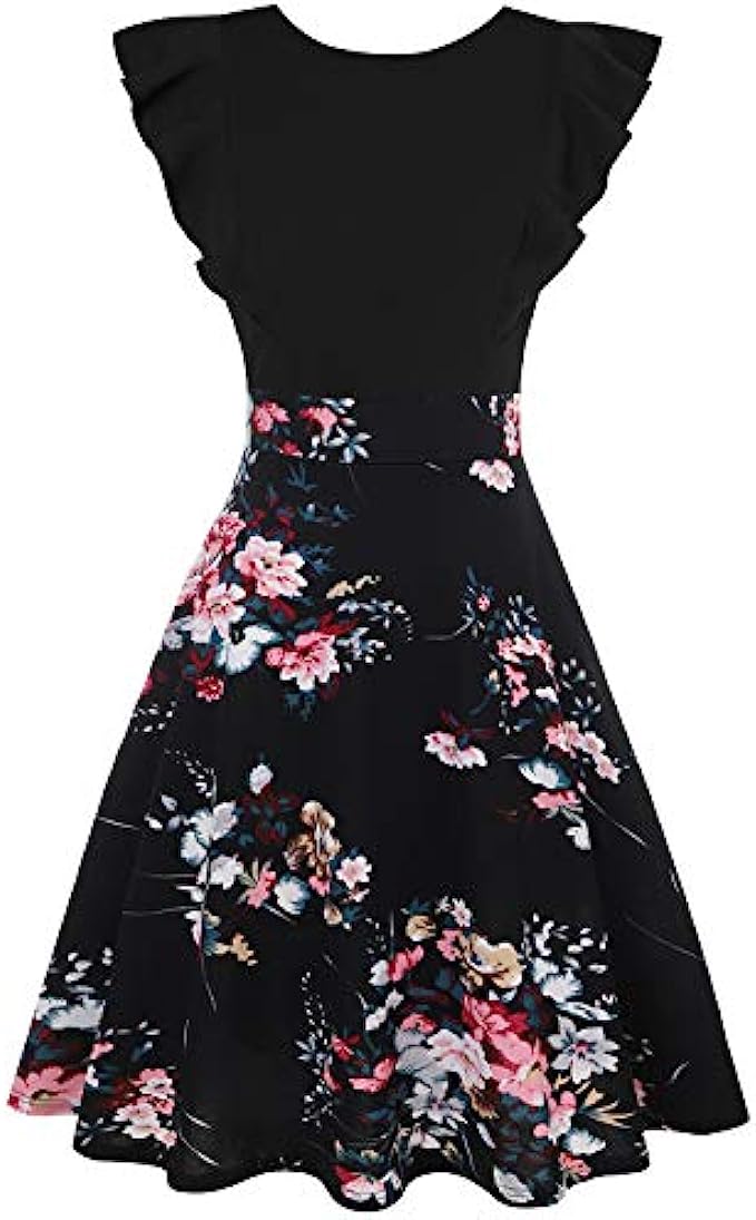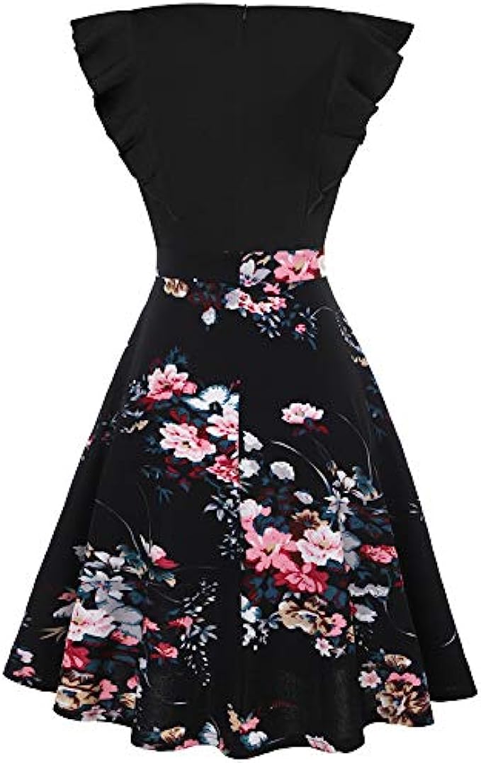 IHOT Women's Vintage Ruffle Floral Flared A Line Swing Casual Cocktail Party Dresses with Pockets