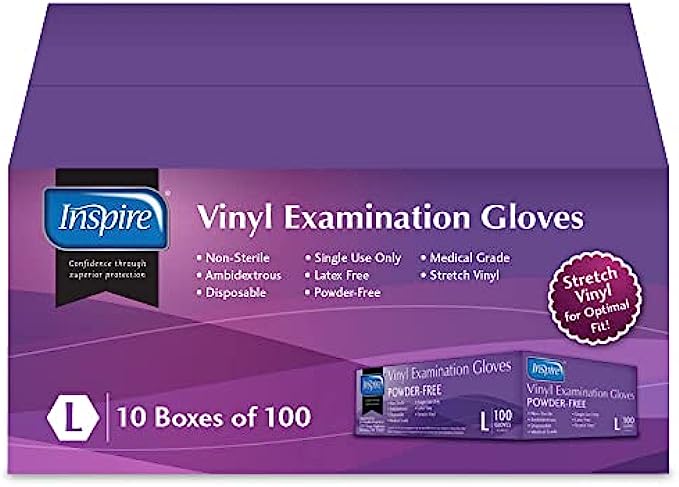 Vinyl Imported PRE-COVID QUALTY: Remember when disposable gloves were strong, rip free and durable? These Inspire Gloves are the Original Quality. Say NO to cheap gloves that do NOT offer adequate protection. Inspire Vinyl gloves offer the security and strength demanded by today's professionals. Also see our Inspire Nitrile Gloves and a full selection of Inspire gloves disposable latex free, latex gloves , rubber gloves and medical gloves. VINYL STRETCH - STRENGTH AND DEXTERITY: Inspire Stretch Vinyl Gloves provide strong protection every time. Rugged vinyl material is rip and puncture resistant, yet offers a secure fit, ease of movement, superior tactile control, and ultimate dexterity. TRUSTED BY PROFESSIONALS: The exam grade glove trusted by medical professionals. Whether emergency services, doctors, nurses or food and household use, Inspire disposable gloves hold up to the job at hand. Medical gloves you can put your trust in. LATEX FREE PROTECTION: Inspire vinyl gloves are NOT made with any latex in production. Powder Free Nitrile Stretch gloves. CONFIDENCE - GLOVES THAT HOLD UP TO THE JOB AT HAND: When your protection is on the line, you demand a glove that will hold up. Inspire Gloves give you the confidence to tackle all scenarios securely and safely. 100 gloves per box, 1000 gloves per case. Case of 10 boxes