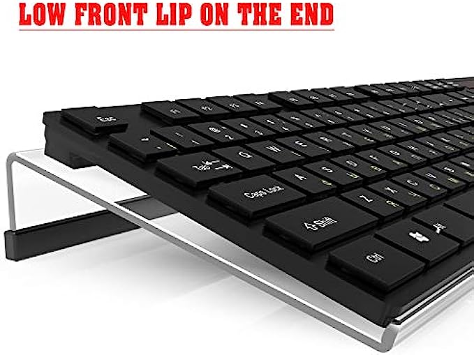Low Front Lip on the End - keyboard riser for desktop holds slimline keyboard, prevents it from falling off the PC keyboard stand when typing.