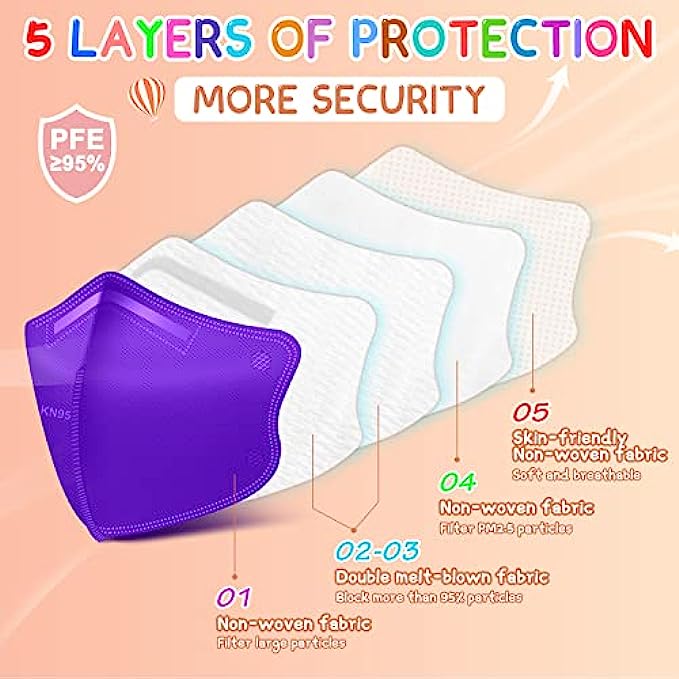 MULTI-COLOR KN95 KID MASKS: Sized at 5.51 inches x 7.08 inches, and the length of the ear loop is 3.2 inches, the stretched length is 7.5 inches. With 5 colors of KN95 kid masks: purple*10pcs, orange*10pcs, yellow*10pcs, green*10pcs, blue*10pcs, total 50 PCS kids face mask. Each kn95 mask comes with a different color ear loop, It can increase the fun of children wearing masks, matching various clothes to show their personality.