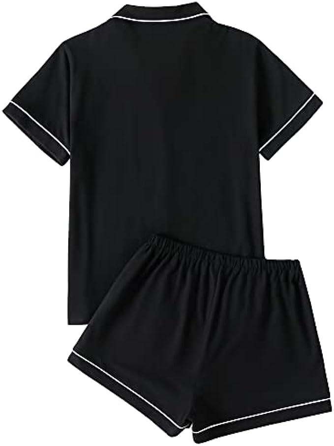 • Notch neck button front shirt top with a chest pocket with heart printed, elastic waistband shorts. Summer V neck shorts lounge set for women and girls.