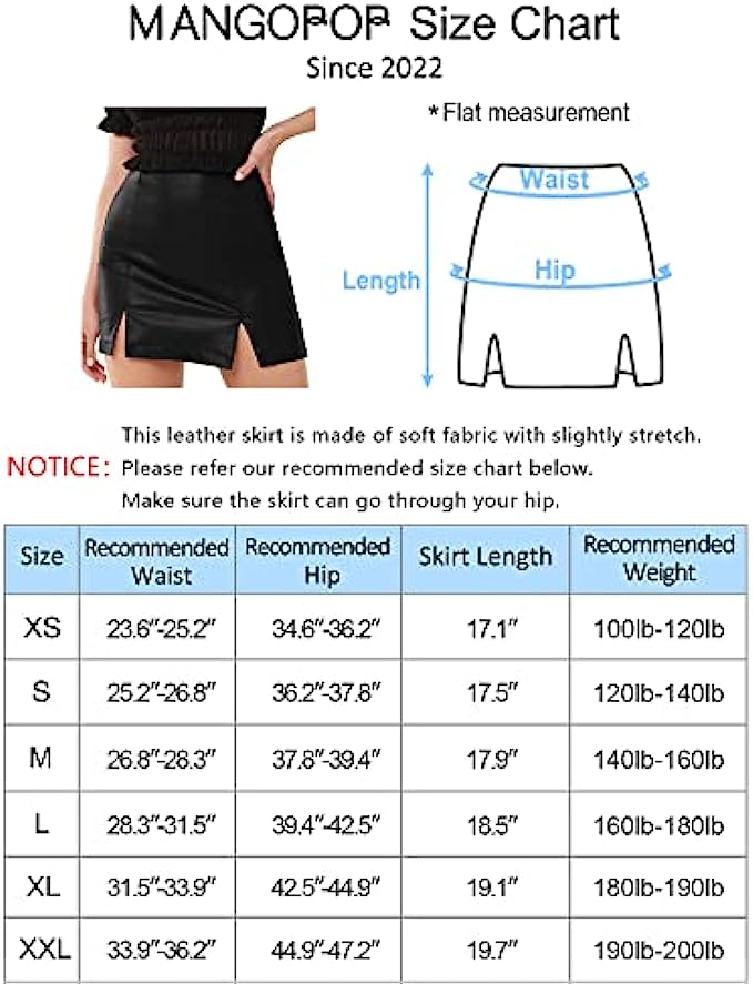 • MINI SHORT SKIRT - Leather skirt for women sexy features with double splits/single split, high waisted, concealed zipper closure in the back, pencil slim fit style, package hip design, above knee length, to show off your ultra-sexy and chic figure. Comfortable room in the butt and thighs make you easy to walk around.