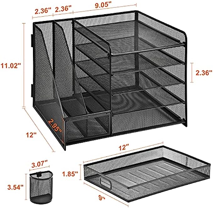?【Space Saving】All office document folders would be organized by the vertical file holder. The paper tray organizer is very suitable for storing books, magazines, letters, and A4 paper. The drawer organizer and hanging pen holder enough accommodate all office supply accessories, such as pens, pencils, scissors, and so on. Perfect Size: 13.8*11*12inch.
