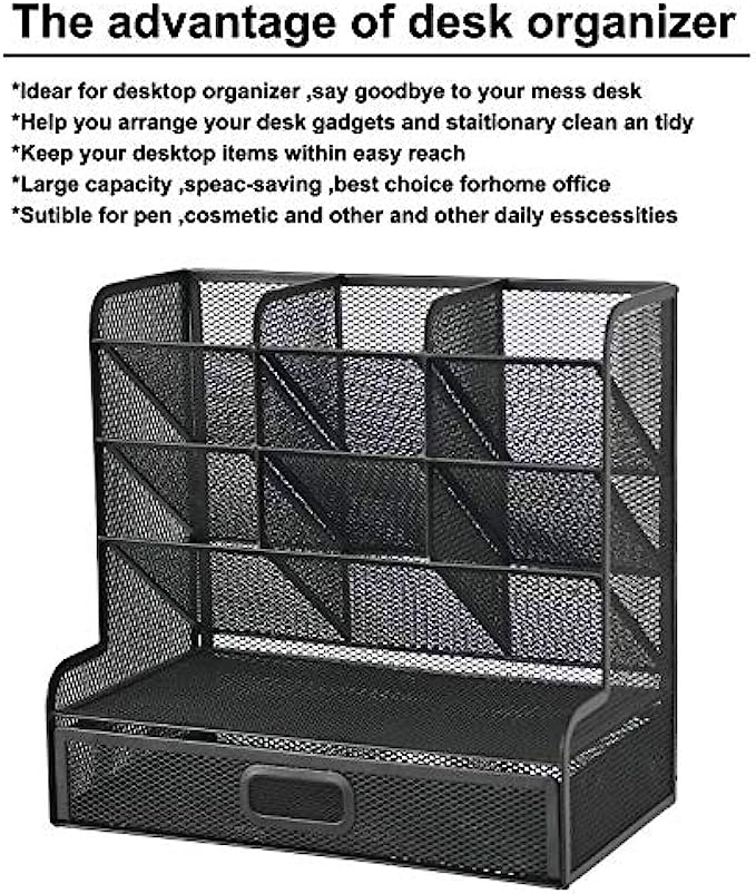 Marbrasse Mesh Desk Organizer, Multi-Functional Pen Holder, Pen Organizer for desk, Desktop Stationary Organizer, Storage Rack for School Home Office Art Supplies (Black Mesh Pen Holder with Drawer)