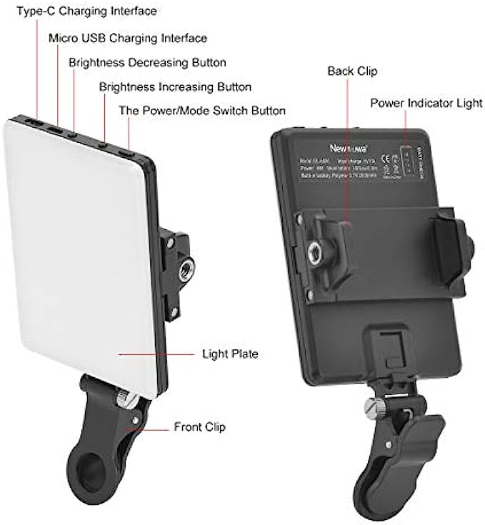 Newmowa 60 LED High Power Rechargeable Clip Fill Video Light with Front & Back Clip, Adjusted 3 Light Modes for Phone, iPhone, Android, iPad, Laptop, for Makeup, Selfie, Vlog, Video Conference