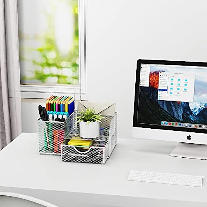 Office Supplies Desk Organizer Caddy for Organization and Accessories with 4 Compartments + 1 Sliding Drawer, Mesh Desk Organizers with Pen Holder for Home School College Dorm Women Desktop, Silver