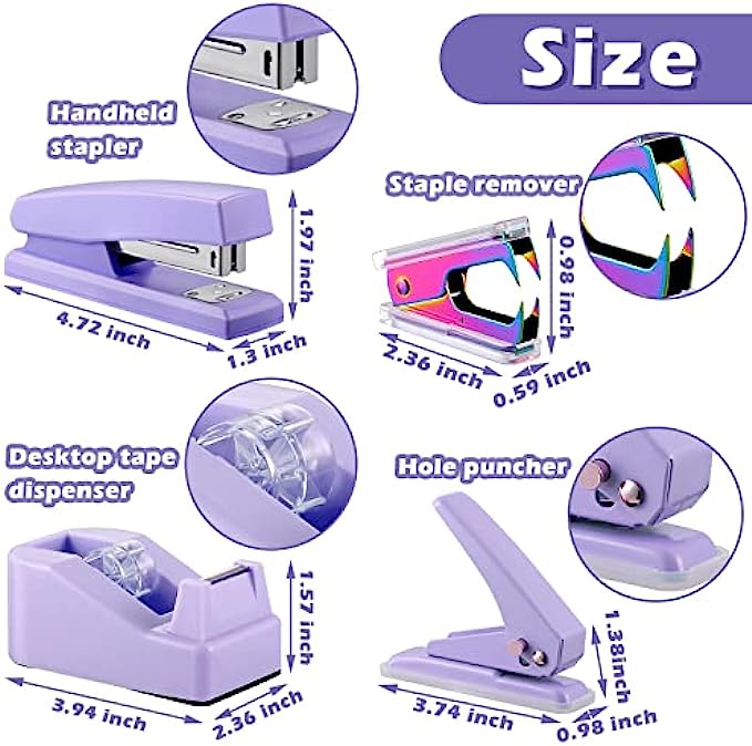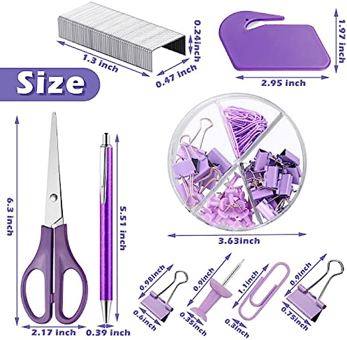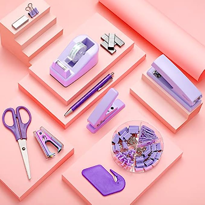 Office Supplies Set Desk Accessory Kit with Stapler Tape Dispenser Staple Remover Staples Hole Puncher Paper Clips Scissor and Letter Opener Ballpoint Pen for Office Clerks Student(Purple)