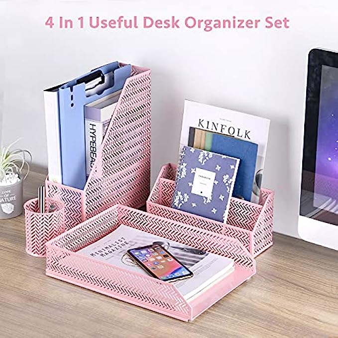 【Four Set Office Organziers Combination to Satisfy Your Needs】: You can store all your accessories with cute desktop organizers for office. One pencil cup, Letter Sorter, Magazine Holder and Paper Tray