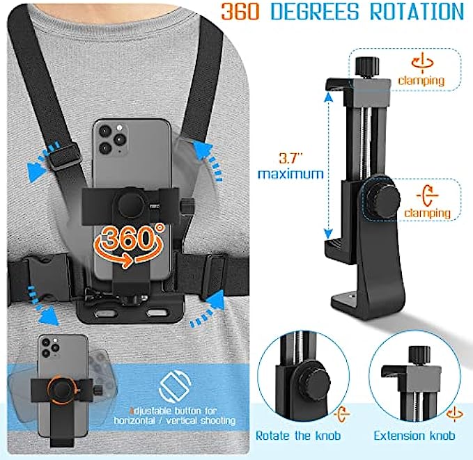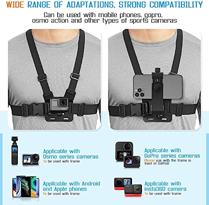 【Mobile phone / sports camera VLOG shooting stand】:This mobile phone chest strap holder for video shooting is the best tool to help players shoot excellent VLOG/POV videos in the first person perspective (FPV). You do not need to hold the GoPro motion camera / mobile phone, and release your hands to bring more freedom. 【Structural stability】: The phone clip has a silicone anti-skid pad to increase friction to protect the phone from slipping, free adjustment of the phone clip 360 degrees, flexible multi-angle rotation, suitable for phones with a width of 4.7 - 7.12in (6-10cm), and the phone clip fixed by screws is very strong. 【High elastic elastic band】: There are five adjustable elastic elastic straps on the Mobile phone Chest Strap Mount which are made of high-quality elastic nylon and ABS buckle. The ribbon is compact, elastic and can be used in water. The tightness is adjustable to fit all adult sizes, so even if you wear the largest winter jacket, it does not affect the wearing of GoPro Chest Strap Mount. 【Use scene】: Suitable for cycling, skateboarding, roller skating, mountaineering, hiking, skiing, diving, boating and other adventure activities; the video shot with chest braces is displayed in the first-person perspective, which is different from the conventional perspective, and the effect is better. NOTEl! The Mobile phone chest strap mount is not recommended for high-intensity exercise, such as running and jumping. 【Widely compatible】: Video shooting kit is suitable for a variety of sports cameras (need to be used with a frame or waterproof case) ,smart phones, and also compatible with GoPro HERO 9 HERO 8 HERO 7 HERO 6 HERO 5 HERO 4 HERO 3 Black White Silver HERO 9 Max Fusion Session or other sports wearable cameras, Such as AKASO/OSMO/Dragon Touch/ACTION/APEMAN/Crosstour/Primary One etc.