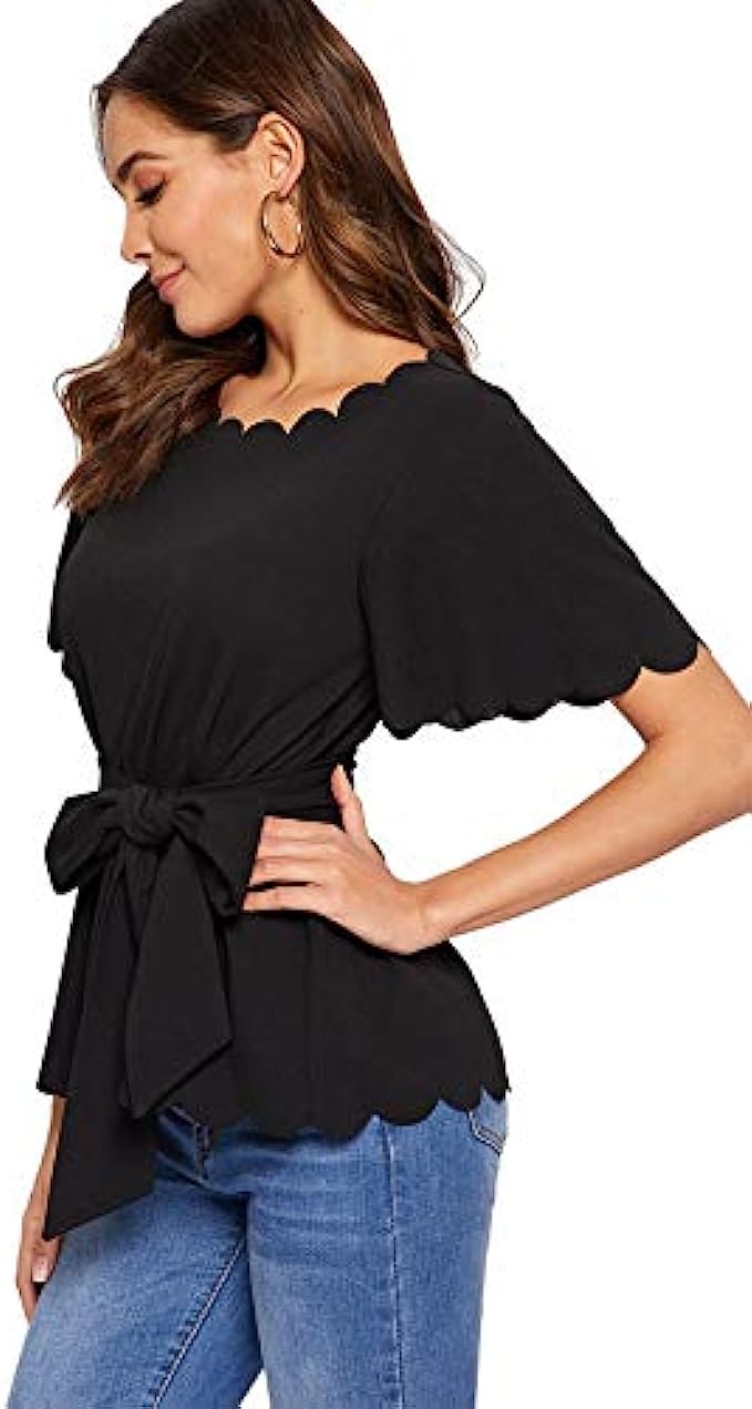 Romwe Women's Bow Self Tie Scalloped Cut Out Short Sleeve Elegant Office Work Tunic Blouse Top