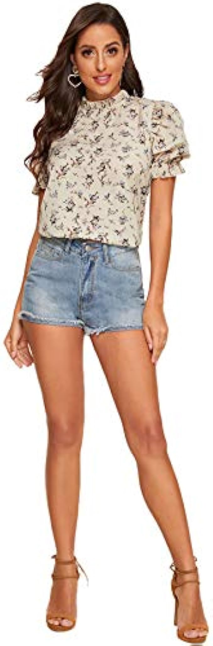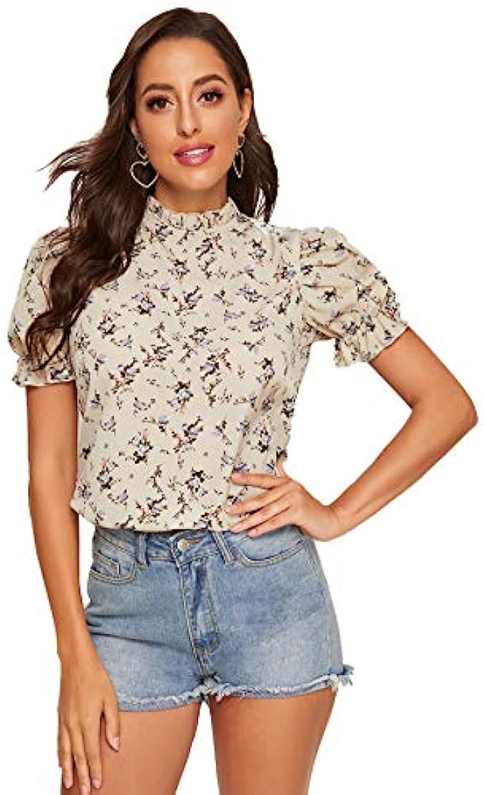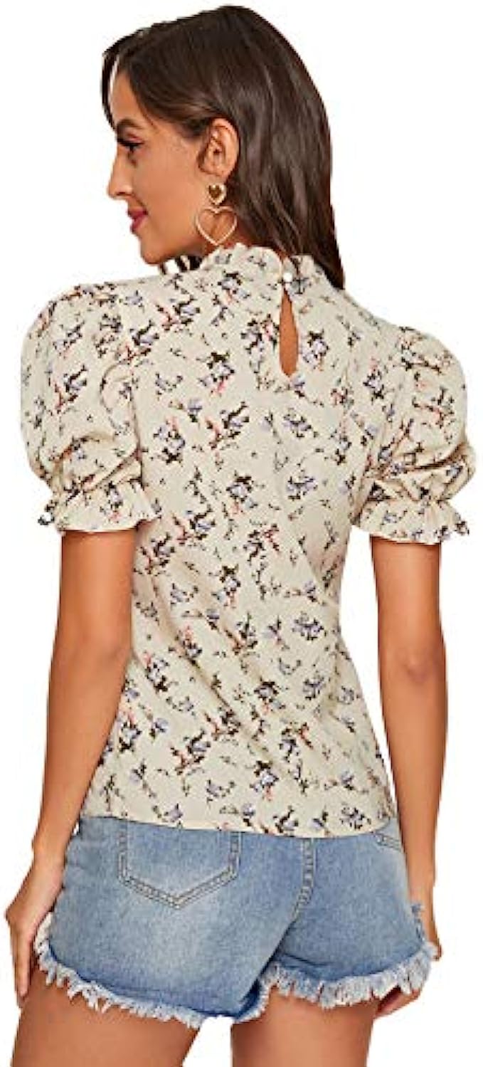 Romwe Women's Floral Print Ruffle Puff Short Sleeve Casual Blouse Tops