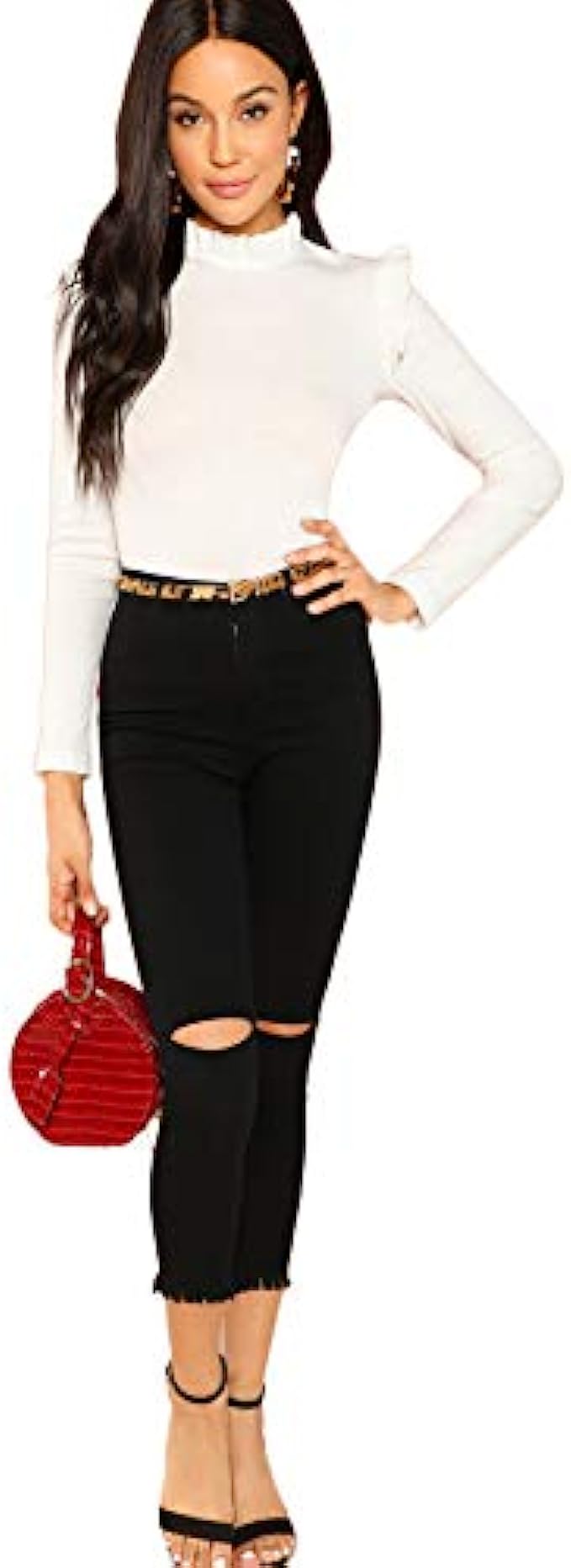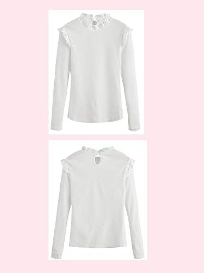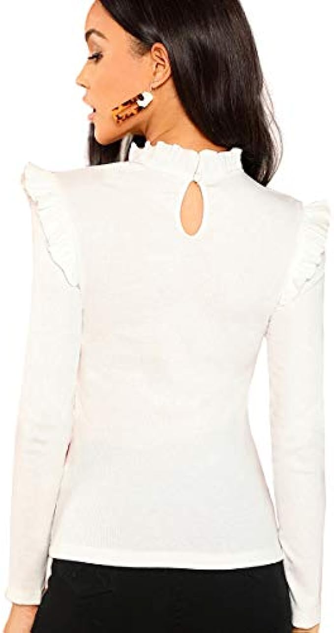 Romwe Women's Stand Collar Slim Fit Frilled Ruffles Shoulder Solid Keyhole Blouse Top