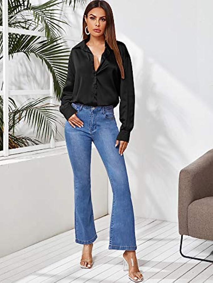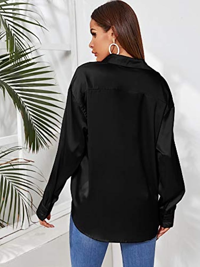SOLY HUX Women's Satin Silk Long Sleeve Button Down Shirt Formal Work Blouse Top