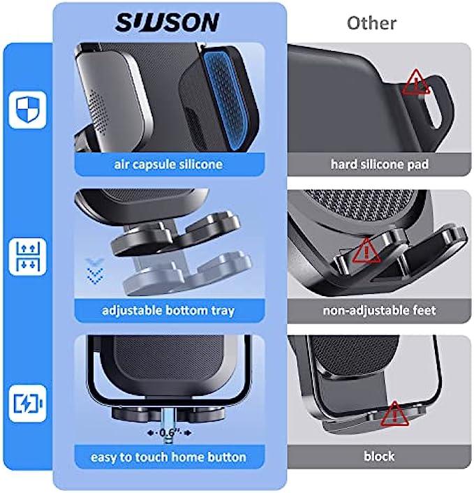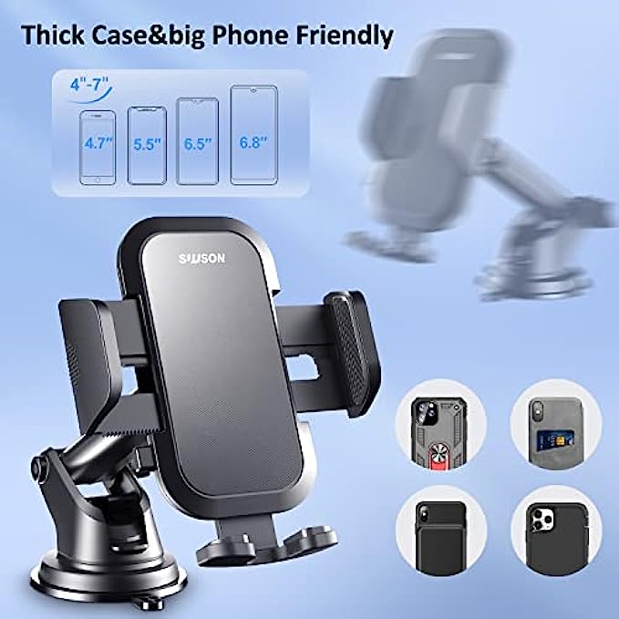 [Three-in-one phone holder for car] Our phone holder for car allows you to install it on the dashboard, windshield or vent without leaving any traces. This mobile phone holder provides you with a simple way to securely fix your mobile phone in place, and is ideal for cars, trucks, SUVs, etc. [Strong Adhesive Suction] The phone holder for car uses a powerful 3-layer viscous gel and a 1-step locking mechanism to provide strong suction on a smooth surface without leaving any residue. They will not fall off even when turning, bumping or driving at high speeds, and using TPU material can withstand temperatures from -4°F to 203°F. To restore the stickiness, simply rinse with warm water and dry.Please note, most likely will not work on leather/ vinyl dashboards. [Easy operation, strong compatibility] One-handed lightly touch, release or lock the phone within a few seconds-super convenient to use while driving. The SUUSON car phone holder mount has adjustable feet, stronger and wider clips, making this phone holder for car suitable for all (4.0"-7.0") mobile phone and mobile phone case combinations. [360°view angle available] 360° ball joint and extendable telescopic arm (4.43"-7.31") allow you to adjust the phone to any angle. This cell phone holder for car allows you to use your phone in portrait and landscape mode. Avoid obstructing the line of sight during driving to ensure driving stability and safety. [Perfect protection, best design] The car phone holder mount is covered with a thick layer of silica gel. The unprecedented design makes the mobile device zero scratches. The internal mechanical structure ensures that the arm holds the phone firmly. No need to worry that your phone will not fall off even on the most bumpy road. If you have any product problems or installation problems, please feel free to contact us, we promise to always provide satisfactory solutions and serve you.