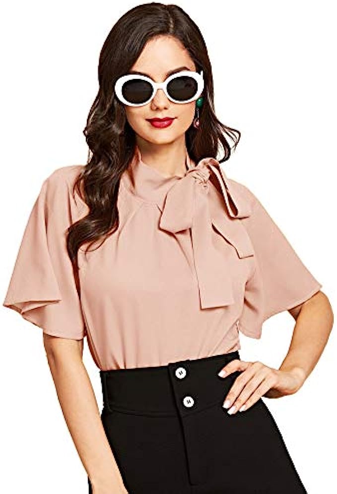 • Side tie neck design at mock neck, lightweight and thin fabric, flutter sleeve, half sleeve, slim fit, retro solid chiffon blouse.
