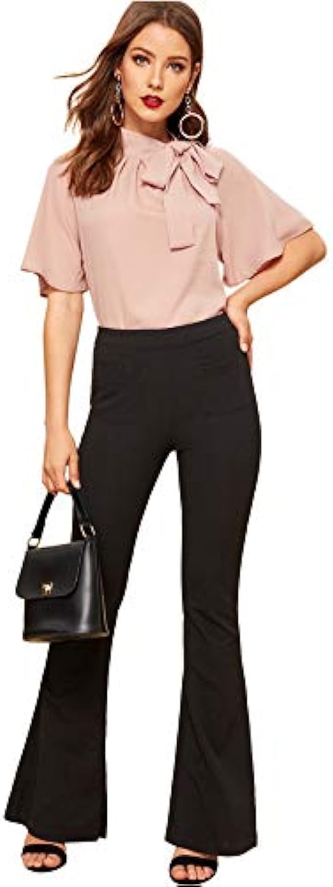 SheIn Women's Casual Side Bow Tie Neck Short Sleeve Blouse Shirt Top