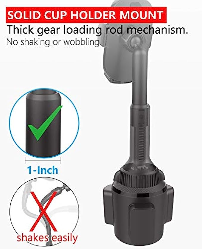 Quick Extension Sturdy Arm: No more screws adjusting, just pull and push to adjust the height. Easy one-hand operation! The car cup holder phone mount can reach a maximum height of 12.4" for easy operating and access to your device without blocking anything on the console. No Blind Sides: Thanks to a rotatable neck, swivel your device quickly and simply at any time to your optimal viewing angle, no more reinstalling the cup phone holder to rotate it to a sweet spot. Tilt, rotate, or swivel easily to adjust your device with the phone holder either in landscape or vertical viewing angle. Solid Adjustable Cup Holder: The adjustable mounting base has 3 rubber padded claws that fit securely into a car cup holder between 3.02" and 4.62" in diameter, no wobbling even on a bumpy road, enjoy hands-free driving, and spend more times at the wheel. Tool-free installation, simply adjust the screw to expand the base to fid your cup holder. One-Hand Operation Versatile Phone Car Mount: One press release design, install or remove a smartphone with only one hand. The cup phone holder for car has a foot and two adjustable arms with a silicon pad, it holds the cell phone tightly. The open bottom tray design provides access to effortless charging. Super Compatibility Cup Phone Holder for Car: Adjustable extension arm design is suitable for all iPhone & Andriod Cell Phones although with a thick case, iPhone cup holder for car compatible with iPhone 13 Pro Max, 13 Pro, 13 Mini, 13, 12 Pro Max, 12 Pro, 12 Mini, 12, 11 Pro Max, 11 Pro, 11, XS Max, XS, XR, X, 8 Plus, 8, 7 Plus, 7, SE (2022), SE (2020), SE, 6s Plus, 6s, 6 Plus, 6, 5s 5c 5 4S 4; cup phone holder for Google Pixel 6Pro 6 5a 5 4a 4XL 4 3aXL 3a 3XL 3 2XL 2 1, Nexus 6P 6 5X 5, etc Universal Cupholder Phone Holder for Car: works for Samsung Galaxy S22Ultra S22+ S22 S21+ S21Ultra S21 S20FE S20 S20Ultra S20+ S10 S10+ S10e S9 S9+ S8 S8+ S7 S6 S5 S4 S3 S2 S, Note 20Ultra 20 10 10+ 9 8 5 4 3 2 1, A91 A90 A80 A72 A71 A70 A70s A60 A53 A52S A52 A51 A50 A50s A42 A41 A40 A40s A33 A32 A31 A30 A30s A23 A22s A22 A21 A20 A13 A12 A11 A10 A10e A10s A03 A02 A01, M62 M53 M52 M51 M42 M42 M40 M33 M32 M32 M31 M30 M23 M22 M21 M20 M12 M11 M10 M02 M01, F62 F52 F42 F41 F23 F22 F12 F02S and more.