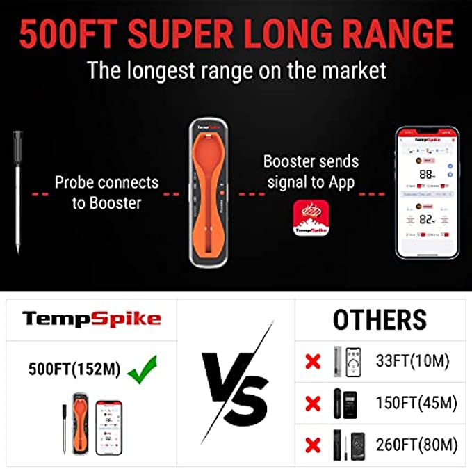 500-Ft Ultra-Long Range: Connected via the most advanced Bluetooth 5.2, this wireless thermometer for grilling can monitor your cooking from up to 500 feet away, truly wirelessly tracking your meal from anywhere!