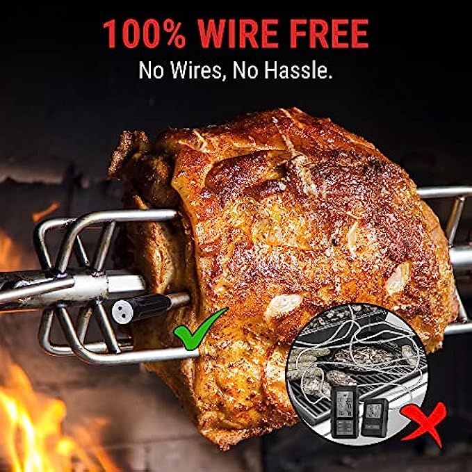 100% Wire-Free: Wireless thermometer for grilling removes all the tanged wires, makes it a versatile tool for electric rotisserie, BBQ, smoker, oven grilling, pan-fry or sous vide; Enjoy 100% wire-free cooking and the convenience of no-hassle setup and cleanup