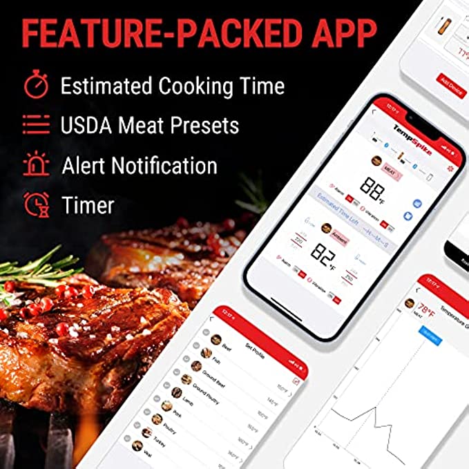 Easy-to-Use, Multifunctional App: Get real-time alerts on the go with the smart thermometer App; Supports custom timer and temperature graphs; USDA-recommended preset temperatures elevate your cooking like a pro every time you fire up your grill with our smoker thermometer