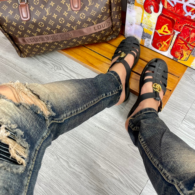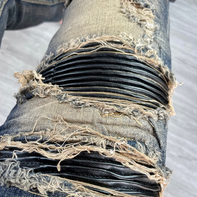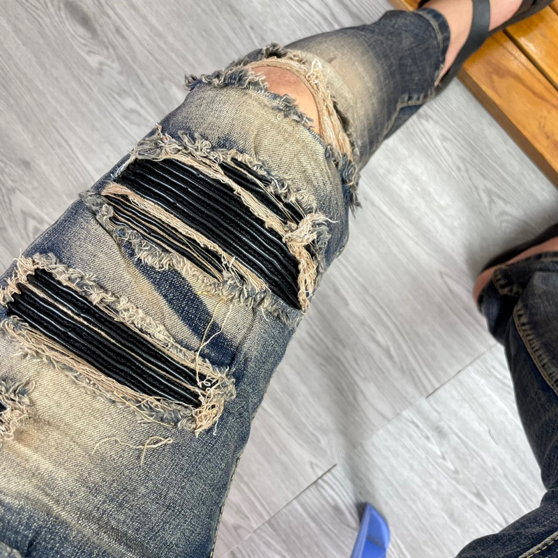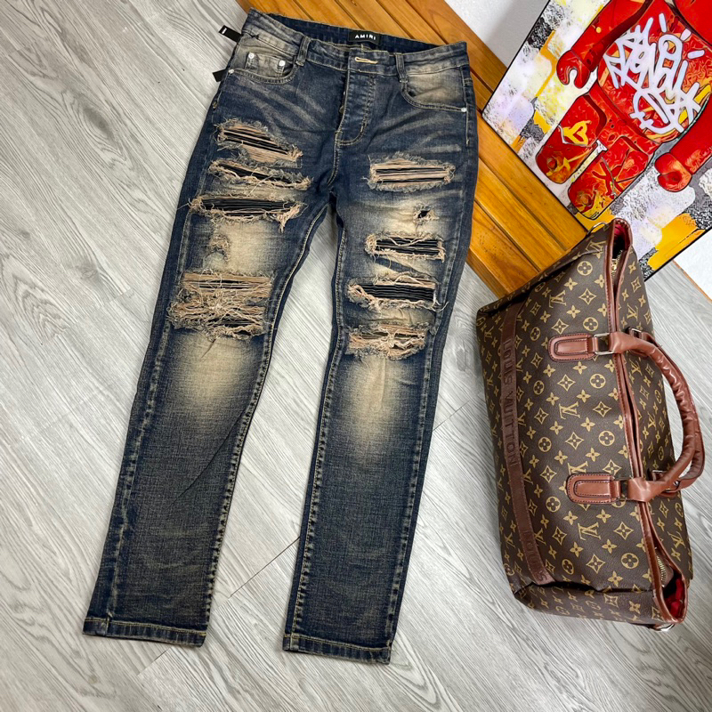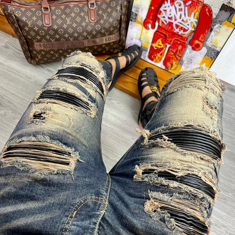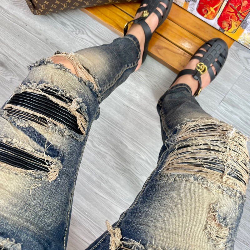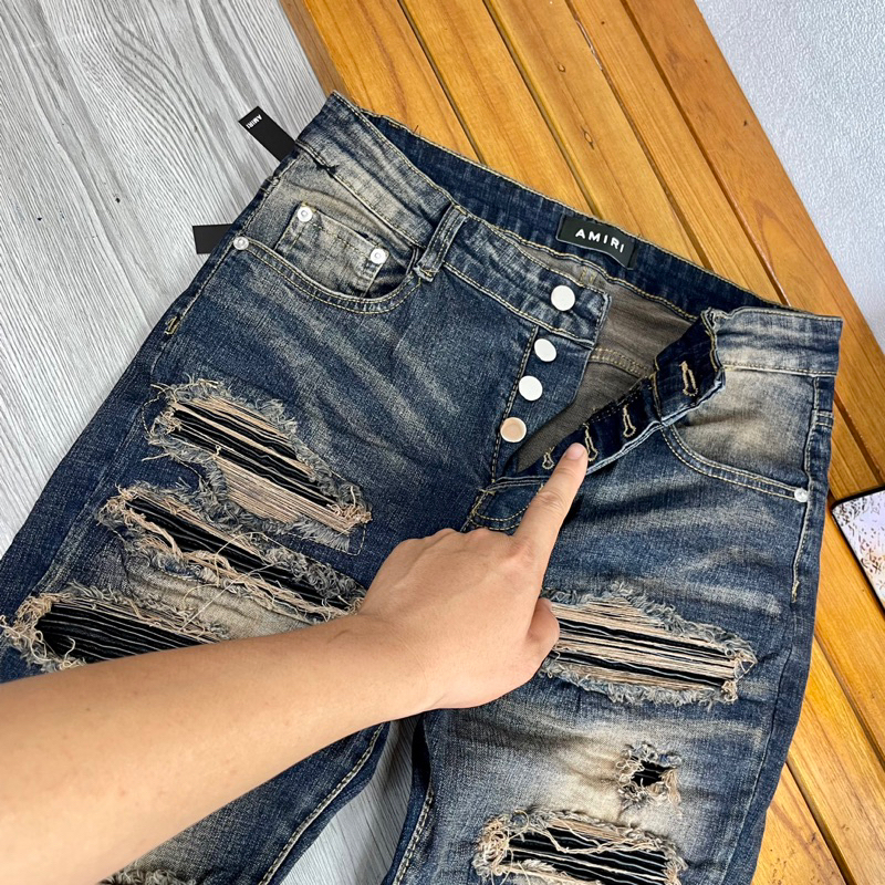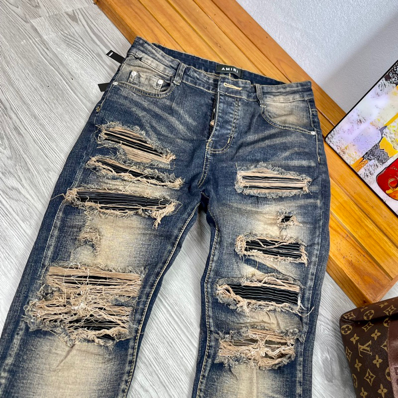 Torn jeans with sturdy border sewn leather pillow, men's Street boy pants 4 amiri buttons