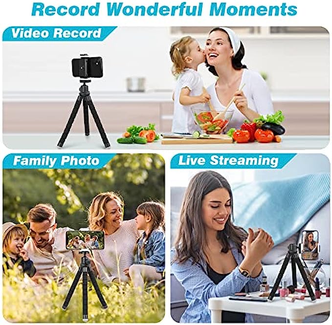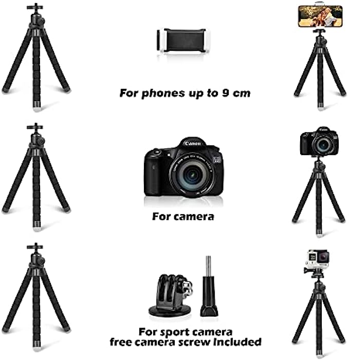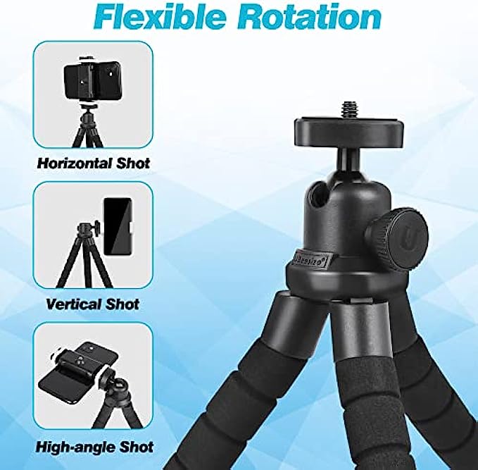 【Premium Quality】 The flexible tripod legs are made of thick premium metal and full metal connector, reinforced with a rubber coating and sturdy foam. The non-skid rubber feet design keeps the adjustable tripod very stable whether on a desk or floor. 【Lightweight and Compact Tripod】 The UBeesize’s extra-flexible legs allow you to instantly bend them to any angle for effortless set-up, and you can even wrap the legs around objects like railings for extra variety in shot compositions and framing. Besides, this flexible tripod can be straightened with ease for storage or putting into backpack for traveling, hiking or camping, or even working as a selfie stick. 【Multi-Angle Shots】The updated clip can be rotated 360 degrees, hold your cellphone in both portrait, vertical, and high angle mode without having to take the phone down. Besides, the 360°rotatable ball joint enables you to control the angle of phone/camera with smooth movement. 【Functional Accessories】 Comes with an upgraded universal phone holder (works for cellphones up to 5.23 inches wide, a wireless Bluetooth remote (compatible with most cell phones and controls up to 30 feet away). By a standard adapter screw thread, it is compatible with digital cameras and GoPro. 【What You Get】 1x Cell Phone Tripod, 1x Wireless Remote, 1x Phone Holder, 1x GoPro Mount Adapters, and 1x User Manual. With any problems about the product, thoughtful and timely customer service is always here for you.