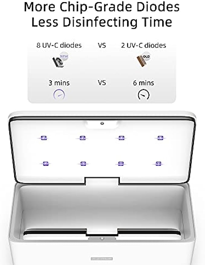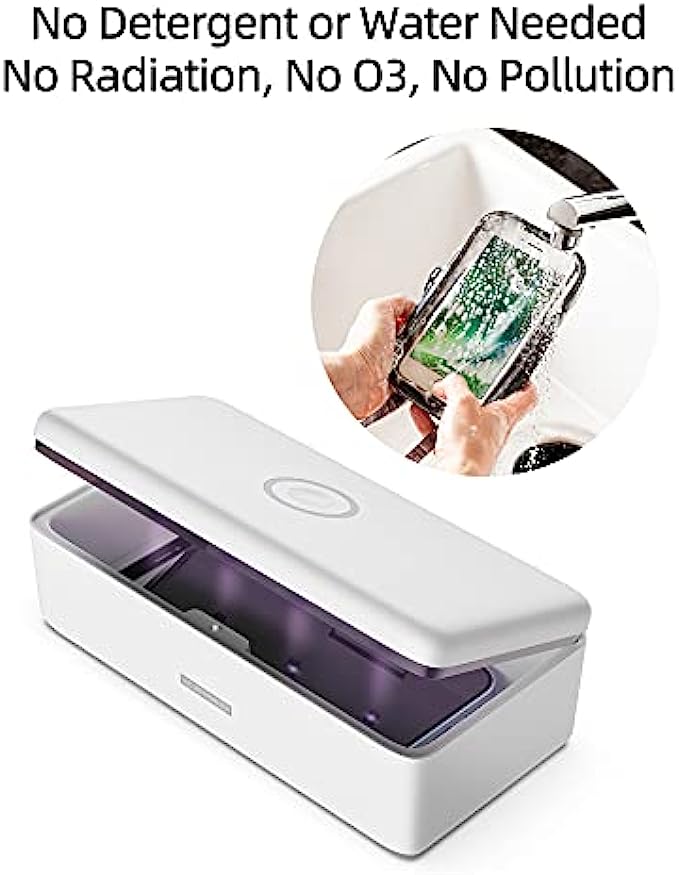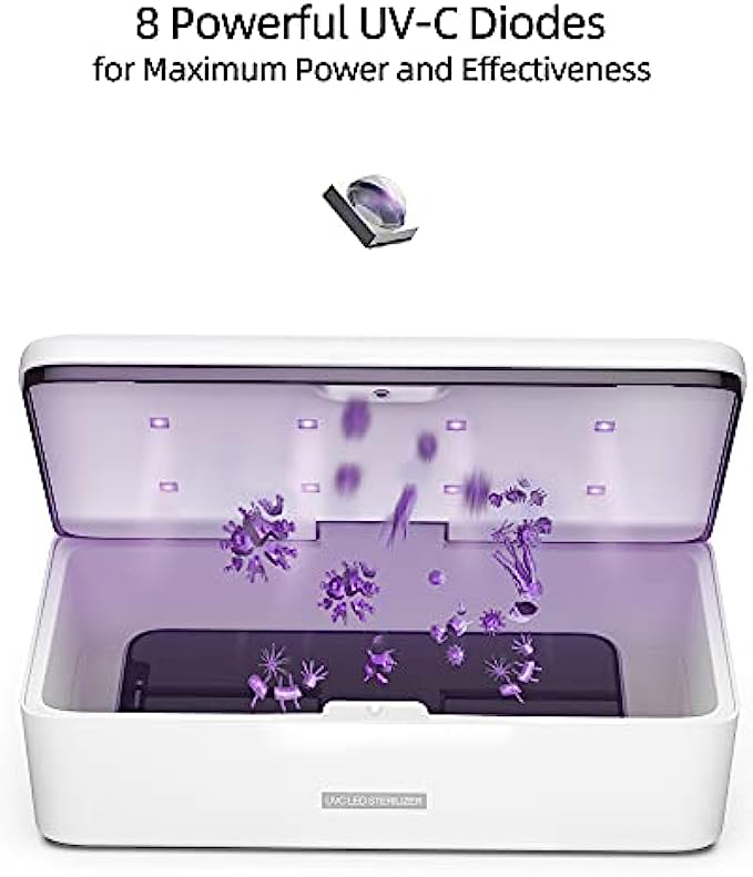 【Stay Healthy with UV Light Sanitizer】Our belongings especially cell phones collect all the bacteria we touch throughout the day, and then store them in warm and dark places such as wallets and pockets to allow bacteria to multiply and grow. Regular use of KPP UV Sanitizer Box will help prevent bacteria and diseases. Make belongings disinfection as easy as washing your hands. EPA Est. No.95175-CHN-1 【Complete 360° UVC Disinfection】Comprehensively sanitizes your personal belongings and every-day essential items that are hard to disinfect or wash by hand. 【3 Mins to Eliminate 99% of Invisible Hazards】 This KPP UV phone sterilizer box houses 8 UV-C LED beads can disrupt DNA & RNA of germs in only 3mins and to block the spread of the virus. Compare to the mercury lamp, we have 10000 hours long lifespan and help eliminate 99% of invisible hazards in just 3 minutes. 【Clean Whatever Fits】 8 x 3.5 x 1.5inch interior size is designed to fit a variety of items such as keys, jewelry, eyeglasses, remotes, makeup brushes, headphones - you name it! 【Certified】 SGS, FCC, EPA certified. No radiation, no residue, no secondary pollution. Auto-off when the cover is opened to protect your eyes and skin. EPA Est. No.95175-CHN-1