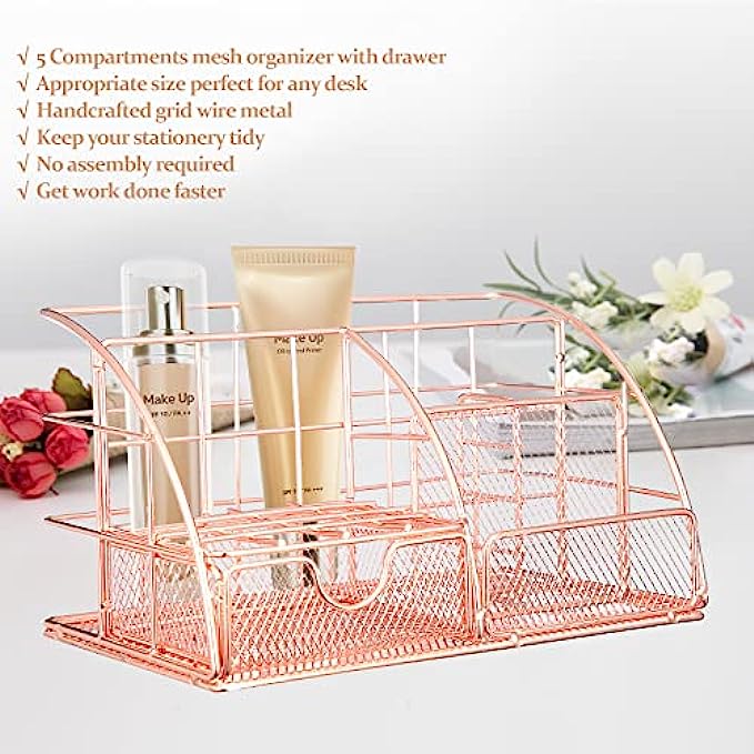 Verdefamily Rose Gold Office Supplies and Accessories, Desk Organizers Set of 3, with Pen Holder for Desk and Phone Holder, Rose Gold Desk Accessories for Women with 5 Compartment + Drawer
