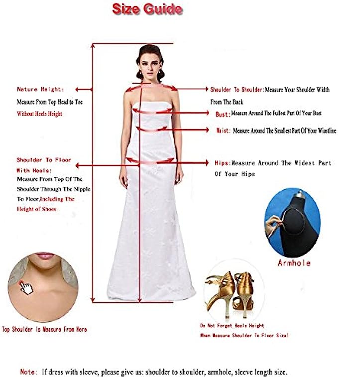 1.Fabric:Satin, lace 2.Notice:Please Select the Size According to Our Size Chart Image on the Top Left¨Do not refer to "Sizing Chart". Please Choose right style, size and color.take accurate measurements 3.We will contact you to confirm the measurement details. If there's no reply from you, we will make this dress as our SIZE CHART. 4.Customized sizes and colors and styles are also available. Please send us your detail size: Bust, Waist, Hips and Hollow to Floor.(See Product Description list) , we are always at your service. 5.The shooting light and setting of your computer screen may cause slight color mismatches. All products are subject to material objects.