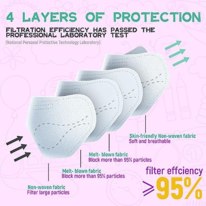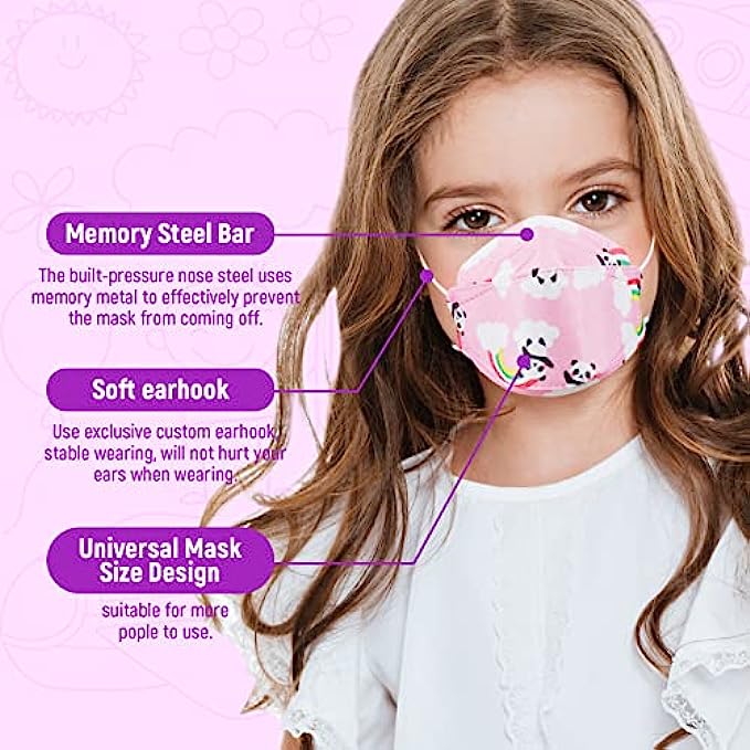• Versatility: 50 pieces per box, 10 pieces per pack, 5 packs in total. These kids cartoon KF94 masks are suitable for office, home, bicycle, grocery store, hospital office and all public places. It's the perfect mask to navigate crowded airports, bus stops, shopping malls and busy city streets.