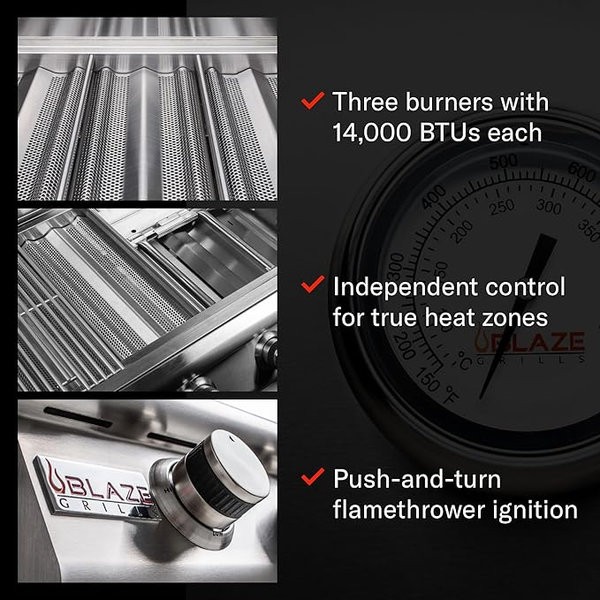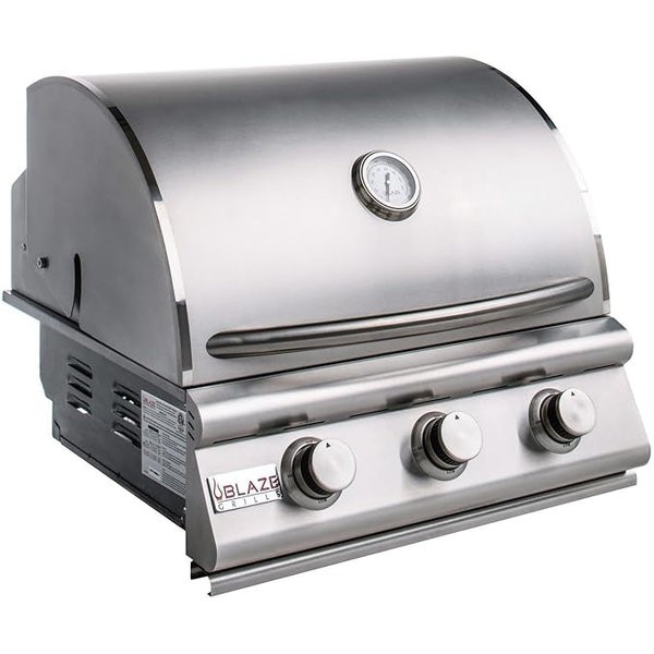Blaze Prelude LBM Built-In Natural Gas Grill | 25-Inch 3-Burner BBQ with 42,000 BTUs | 304 Stainless Steel Construction | Flame Stabilizing Grids | BLZ-3LBM-NG