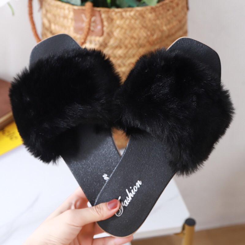 Fashionable Fur Slippers With Horizontal Bands And Soft Soles For Indoor Outing C-228