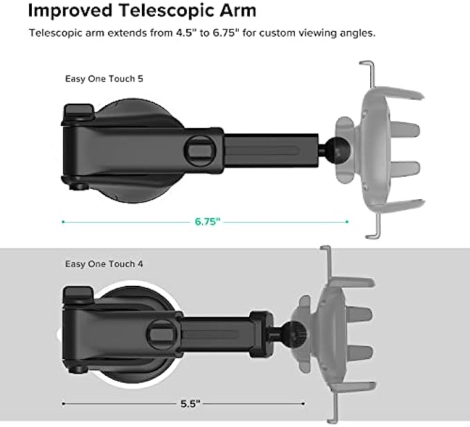 TELESCOPIC ARM: The improved telescopic arm now extends from 5 inches to 8 inches (as opposed to the Easy One Touch 4 which only extended to 6.5inch) and pivots 260 degrees. This enables a myriad of customized viewing angles while you’re on the road.