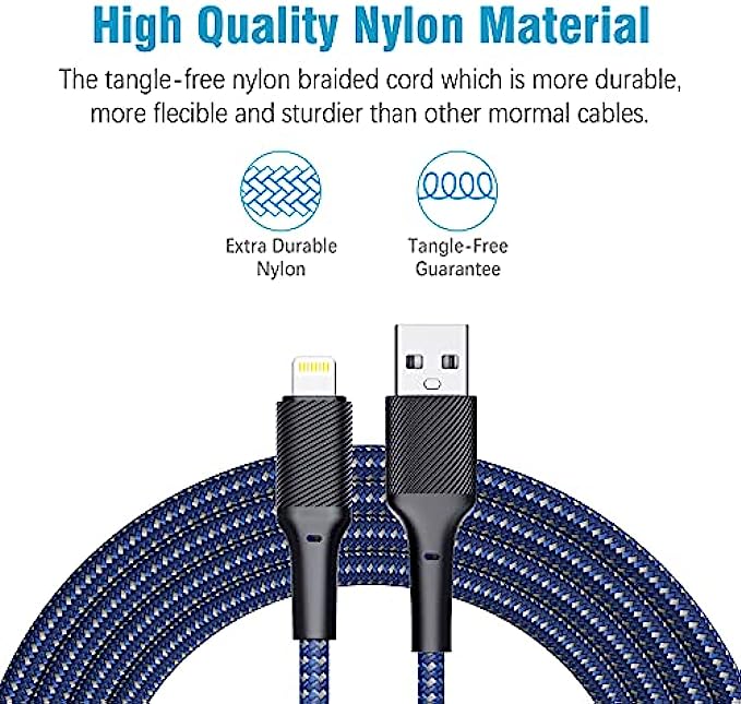 • Nylon Braided iPhone Charger Cable :IPhone charging cable with reinforced joint design that have passed 15,000+ times bending tests for extra protection and durability.braided nylon insulation and precisely layer-welded connectors,which make cable more durable and sturdier than normal iPhone charger cables but also flexible and tangle-free. Withstand a variety of everyday connection needs and long-term use