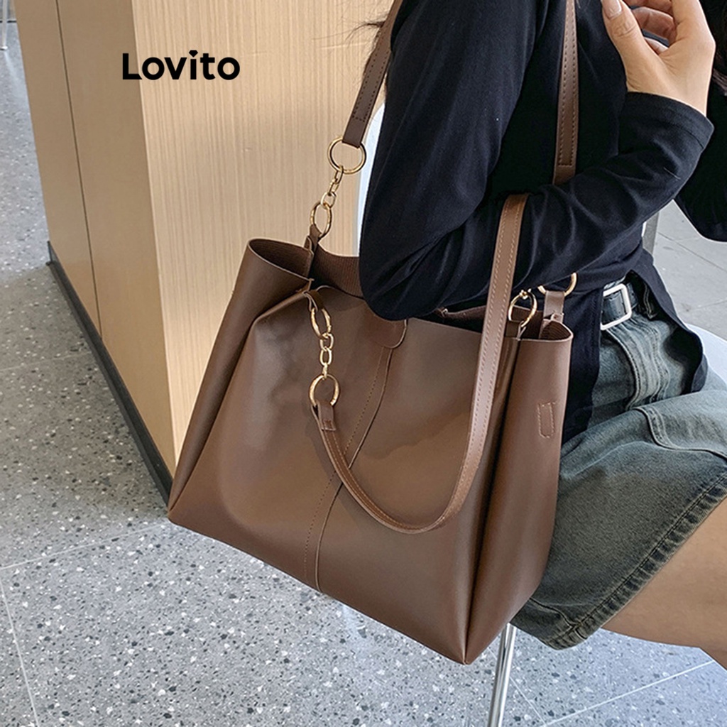 Lovito Casual Plain High Capacity Commuting Textured Shoulder Tote Bag for Women LFA04285 (Brown/Off White/Black)