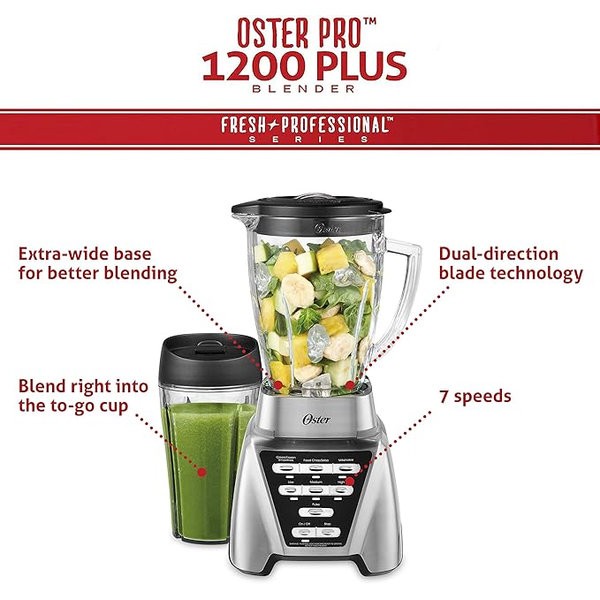 Oster Pro 1200 Smoothie Blender with Glass Jar & 24oz To-Go Cup, Countertop Kitchen Blender with 7 Speeds, 1200W Power, Brushed Nickel